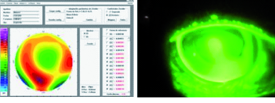 CASO 1: Paciente varón (M.G.C.) sometido a QPP en OI por queratocono. Tras la QPP la córnea quedó oblata y muy irregular, con excentricidad -0,34, por tanto se decidió adaptar una LC RGP especial para córneas operadas (Post Graft). Con esta LC el paciente consigue una AV muy satisfactoria (0,8) y puede usarla durante 18 horas diarias, ya que no utiliza gafas debido a la deficiente AV que obtiene con ellas (MM). En la figura 1A se muestra el mapa de Zernike, donde se ve el elevado coeficiente de aberraciones (1,9). En la figura 1B, se muestra el fluorograma de la LC adaptada: RGP Post Graft, R0 6.90 mm, P-18.25 D y ØT 10.40 mm, donde se puede apreciar que la distribución de la película lagrimal no es uniforme debido a las irregularidades corneales y se ve claramente el charco lagrimal que rellena la zona oblata. No existe toque en ningún punto ni teñido alguno tras la revisión con las LC puestas10 horas.