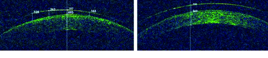 En la figuras 3A y 3B se muestran las Tomografías de Coherencia Óptica (OCT) de las córneas tras la QPP con las LC adaptadas a estos pacientes. En el paciente 1, se aprecia el aumento de la película lagrimal en la zona correspondiente a la zona oblata de la córnea. En la OCT del paciente 2 se observa una altura uniforme del menisco lagrimal formado entre la cara posterior de la LC semiescleral y la superficie anterior de la córnea, lo que asegura una correcta integridad corneal.