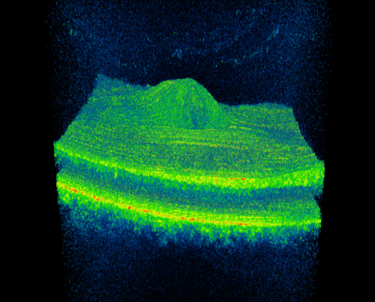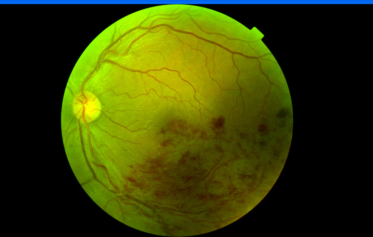 Fotografía científica: Oclusión rama venosa retina (ORVR). Rama temporal inferior coooa / 22 julio, 2014 La oclusión de la vena en el cruce arterio-venoso provoca hemorragias en llamas, debido a que siguen el mismo curso de la capa de fibras nerviosas, y extravasación en capas superficiales produciendo Edema Macular Quístico. Autor: Jorge Haro López. Colegiado: 9653 Comparte esto:TweetMe gusta Cargando...