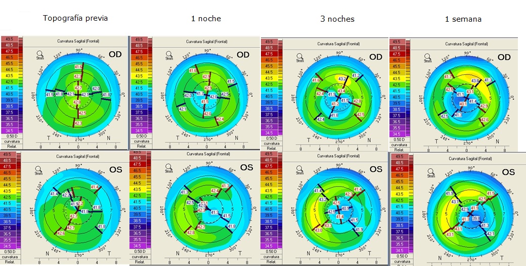- El caso nos muestra que hay cambios refractivos y topográficos que manifiestan que las lentes de hidrogel de silicona adaptadas “al revés” producen un efecto orto-k.