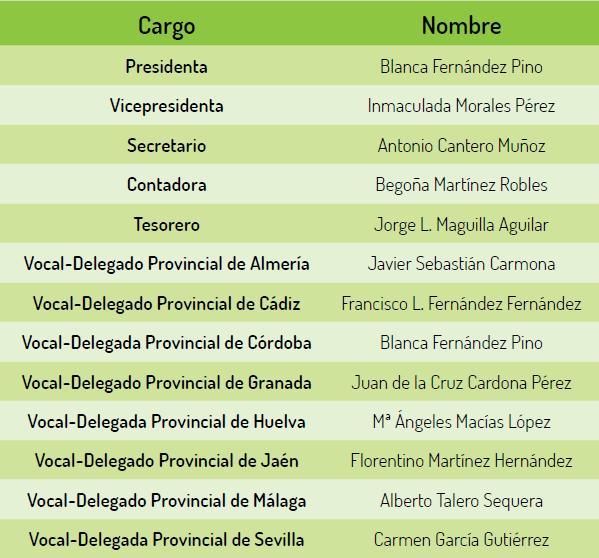 Los colegiados que han visto ampliado sus cargos por un periodo de 4 años al ser candidaturas únicas han sido los siguientes: como secretario, Antonio Cantero Muñoz. Como vocal-delegado provincial de Granada, Juan de la Cruz Cardona Pérez. Como vocal-delegada provincial de Huelva, Mª Ángeles Macías López. Y por último, como vocal-delegado provincial de Málaga, Alberto Talero Sequera. Los colegiados elegidos tomaron posesión de sus cargos en la Junta de Gobierno de 26 de julio de 2014. En la siguiente tabla se expresa la composición actual de los cargos que constituyen la Junta de Gobierno del Colegio Oficial de Ópticos-Optometristas de Andalucía.