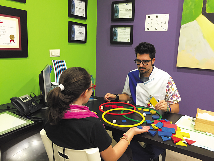 La remodelación de la sinapsis, como la describen Kandel y otros autores, está en el centro de los cambios que vemos tras la terapia visual. Sabemos que es una herramienta que provoca cambios neurofisiológicos y que, por lo tanto, no es un simple trabajo muscular. Por eso, también se le conoce como Rehabilitación Neuro-Optométrica. En el caso de la ambliopía trabajamos en binocular desde el principio, dando gran importancia al trabajo monocular en campo binocular. Además, trabajamos sobre todas las habilidades visuales que se encuentran disminuidas, como la motilidad ocular, la coordinación ojo-mano, la acomodación, periferia, localización espacial, visuo-percepción y abrimos los procedimientos incorporando movimiento, conciencia, integración sensorial y organización periférico-central.