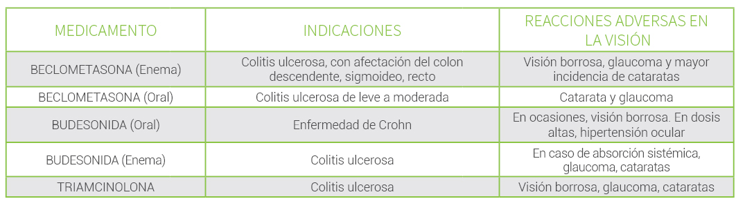 A continuación puedes consultar una serie de medicamentos antiinflamatorios intestinales y las posibles reacciones adversas que pueden provocar en la visión del paciente.