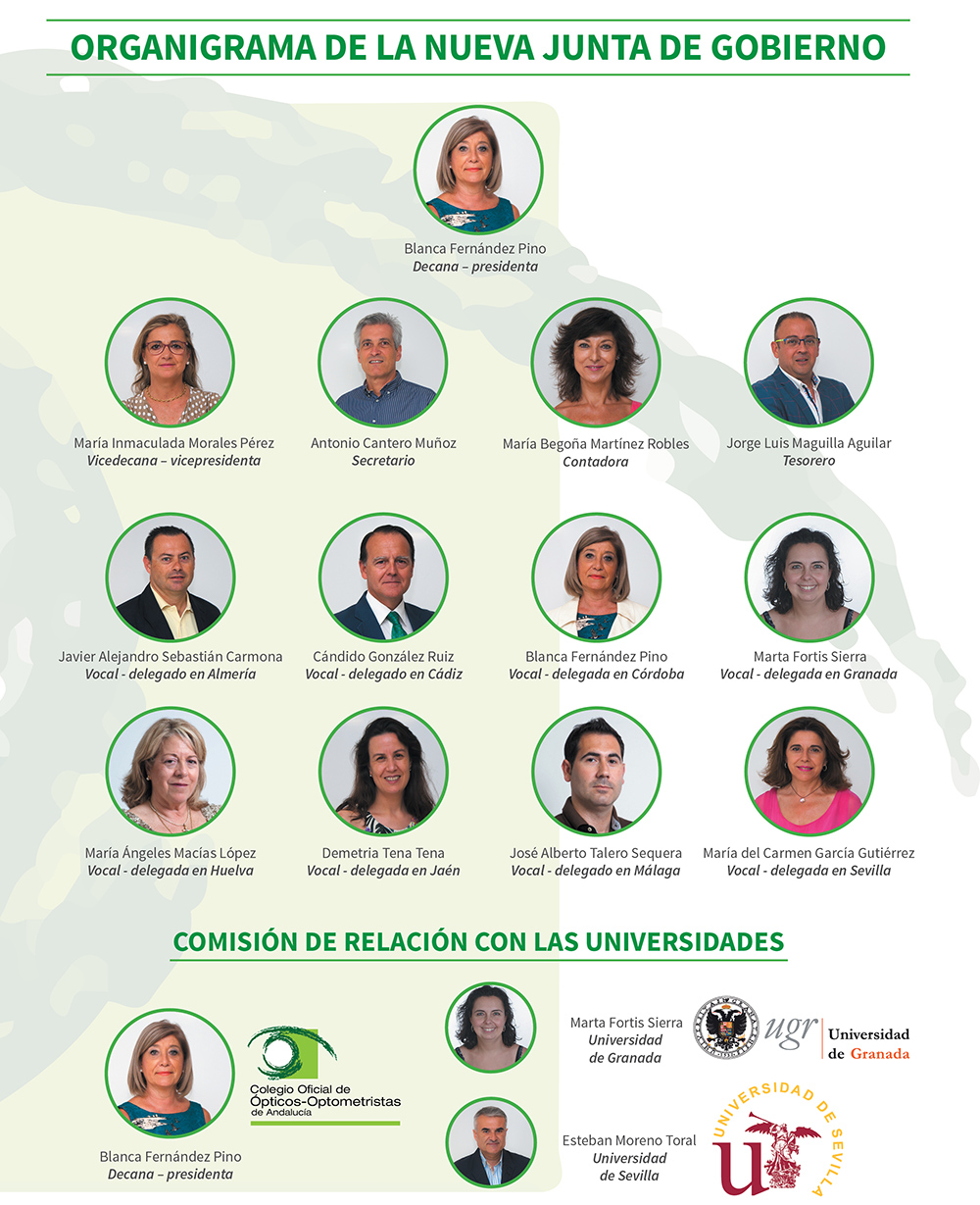 Tras la celebración de las pasadas elecciones, convocadas con fecha 11 de abril de 2016 en uso de las facultades atribuidas por el artículo 56.1º de los Estatutos para la renovación parcial de cargos, ha quedado conformada la nueva Junta de Gobierno del Colegio Oficial de Ópticos-Optometristas de Andalucía gracias a la reelección de algunos cargos y la elección de nuevos miembros que pasan a integrar la directiva de esta entidad.