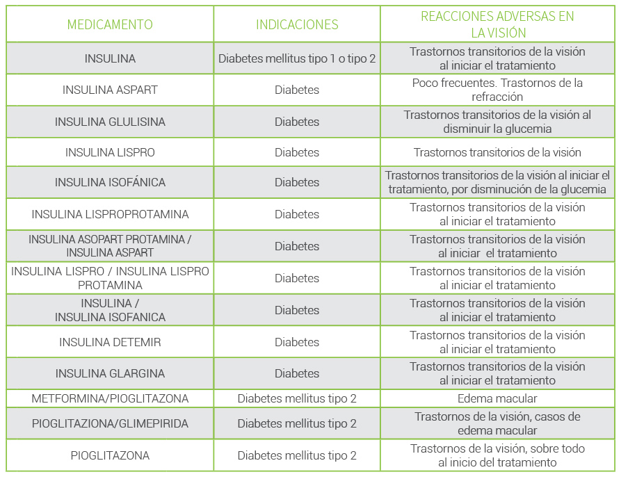 En la siguiente tabla puedes comprobar los diferentes trastornos y reacciones adversas en la visión que podrían provocar una serie de medicamentos relacionados con el control de la enfermedad de la diabetes.