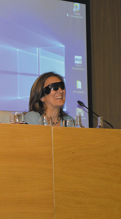 Uno de los momentos más esperados por el público asistente fue la participación de Guadalupe Iglesias, paciente con retinosis pigmentaria diagnosticada con “ceguera legal” pero que, a través de la implantación de un microchip con electrodos, es capaz de tener una visión artificial en blanco y negro a través de unas gafas, que le permite percibir formas de objetos y personas. Durante su charla comentó que, aunque está contenta con su estado actual y volvería a someterse a la misma operación, reconoce que este sistema “no es la panacea” y que aún queda mucho camino por recorrer en este ámbito, en el que deposita sus esperanzas. El más cercano, un nuevo software más evolucionado que verá la luz próximamente y que permitirá a su usuario ampliar las capacidades visuales con respecto al anterior modelo.