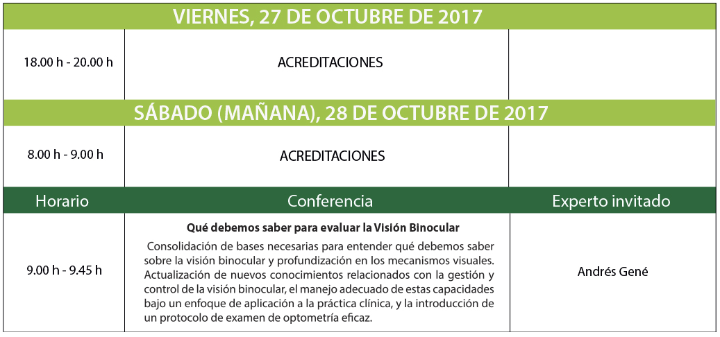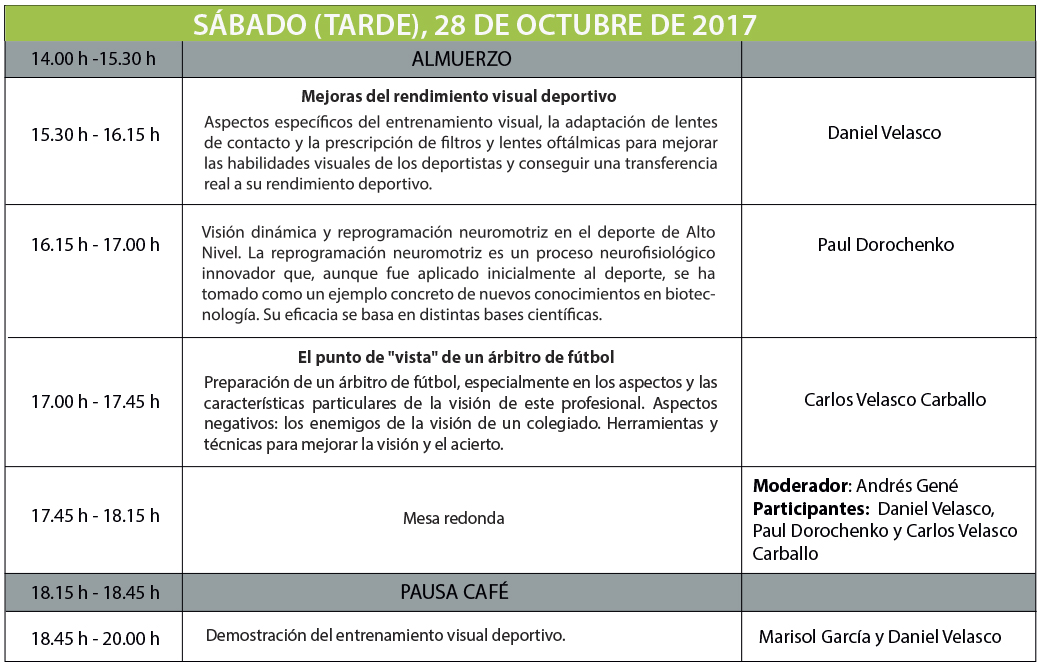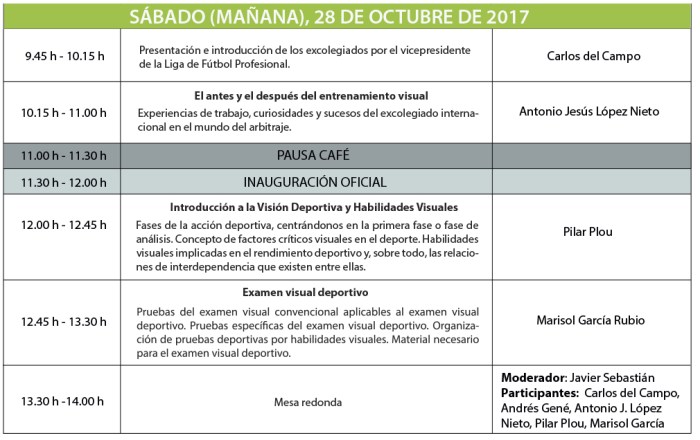 A esta cita de formación de gran interés científico para el colectivo óptico-optometrista andaluz acudirán una serie de expertos profesionales de la visión y el deporte que llevarán a cabo conferencias en las que se abordará cómo se puede mejorar el rendimiento visual deportivo, la visión dinámica y reprogramación neuromotriz en el deporte de alto nivel o la visión del arbitraje desde la Liga de Fútbol Profesional (LFP), entre otros temas.