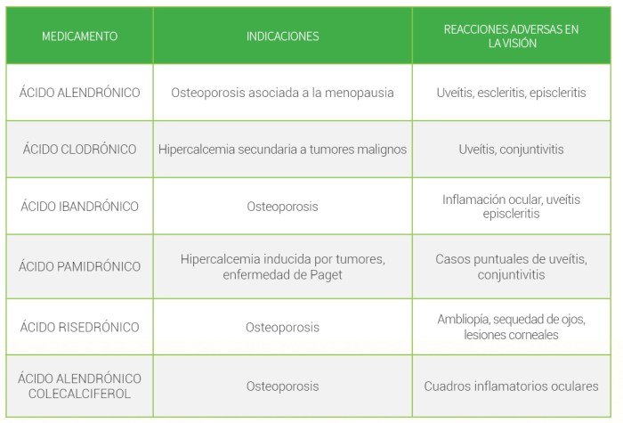 La mayoría de los medicamentos pueden provocar en el organismo efectos adversos, sobre todo si no se utilizan de la manera correcta en la que se han prescrito. A continuación puedes observar las posibles secuelas que pueden originar en la visión de los pacientes una serie de fármacos de la familia de los biofosfonatos.