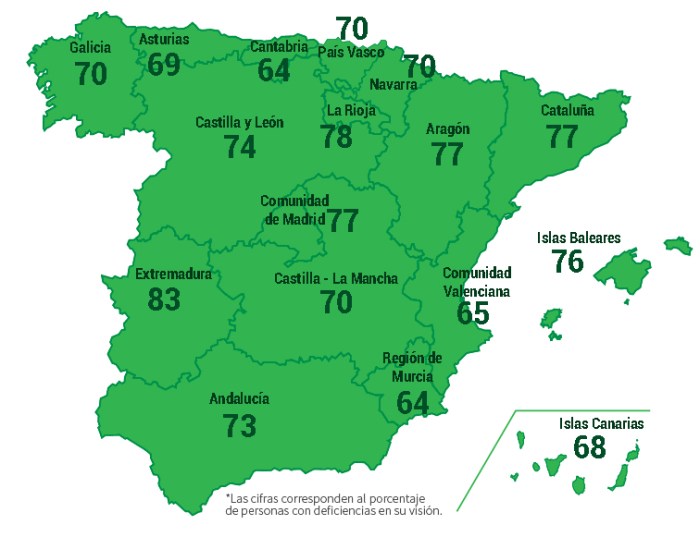 Frente a este dato se encuentran regiones como Murcia o Cantabria, en la que ‘solo’ el 64% de la población tiene alguna anomalía visual. Andalucía se encuentra a mitad de esta tabla, con una cifra cercana al 73%.