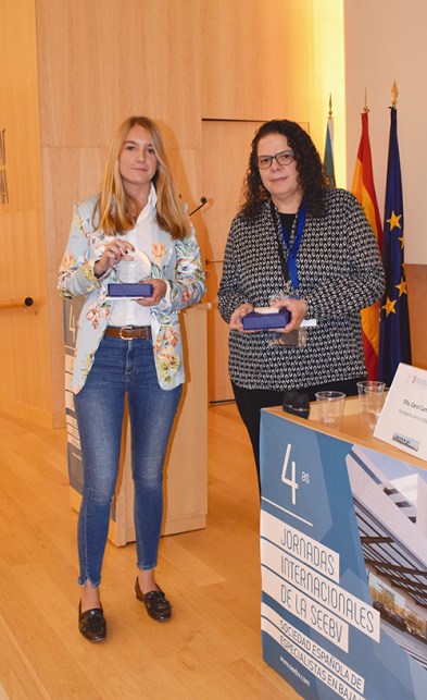 Maite González Duro y Elena Molina Cumella (izquierda) fueron reconocidas con este prestigioso galardón en las IV Jornadas de la Sociedad Española de Especialistas en Baja Visión (SEEBV) por la presentación de un programa de rehabilitación visual y seguimiento para pacientes con el síndrome de Ehlers-Danlos. Entregó el premio la óptico-optometrista Pilar Torrego (derecha).