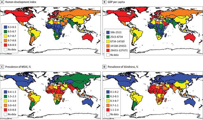 Durante el estudio se evaluaron las correlaciones entre los datos de prevalencia y los índices socioeconómicos, variable donde se observó una fuerte asociación negativa entre las tasas de prevalencia de MSVI y la ceguera y el nivel socioeconómico de desarrollo. La prevalencia estandarizada por edad (SD) promedio de MSVI disminuyó de 4,38% (1,32%) en regiones de HDI bajo a 1,51% (1.00%) en regiones de HDI muy alto ( p <001). El nivel nacional de HDI fue atribuible al 56,3% de la variación global en las tasas de prevalencia de MSVI y al 67,1% de la variación global en las tasas de prevalencia de ceguera.