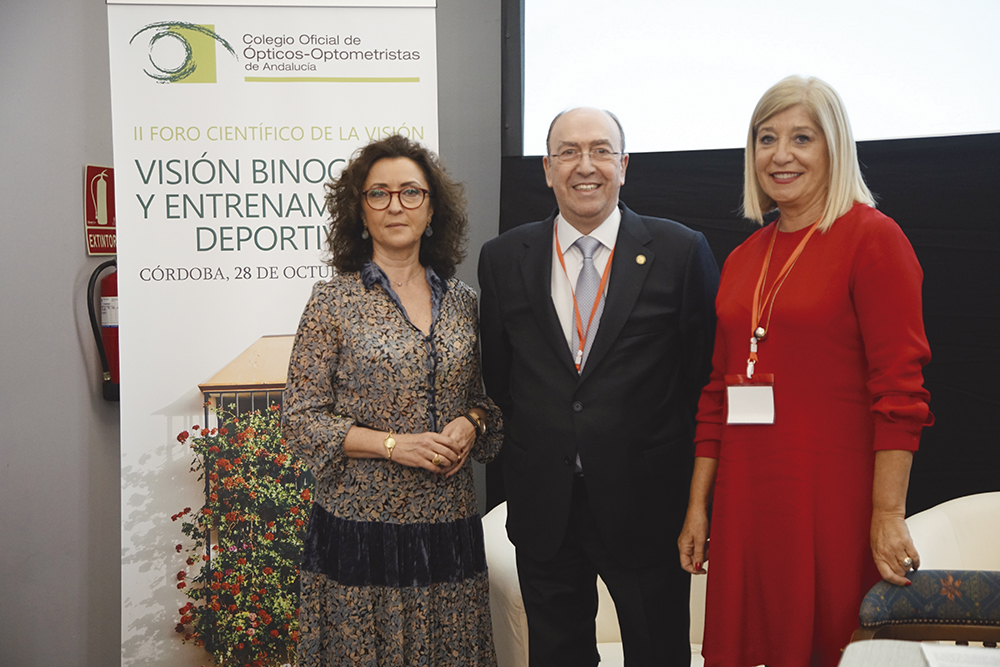 La viceconsejera de Salud de la Junta de Andalucía, Mª Isabel Baena; el presidente del Consejo General de Colegios de Ópticos-Optometristas (CGCOO), Juan Carlos Martínez Moral; y la presidenta del COOOA, Blanca Fernández Pino, fueron los encargados de inaugurar las jornadas