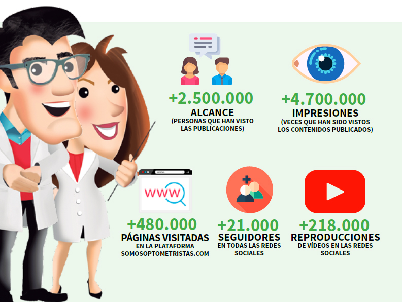 Los contenidos publicados a través de la iniciativa social de prevención y divulgación ‘Somos Optometristas’ durante 2017 han logrado un gran éxito de difusión, obteniendo un alcance de más de 2.500.000 de personas y más de 4.700.000 impresiones en YouTube, Twitter y Facebook, redes sociales donde se lanzan los mensajes de cada campaña. Estas cifras reflejan un aumento en comparación con las obtenidas durante el pasado año, con una subida de más del 17% en cuanto al número de veces que han sido visto estas publicaciones por parte de la sociedad.