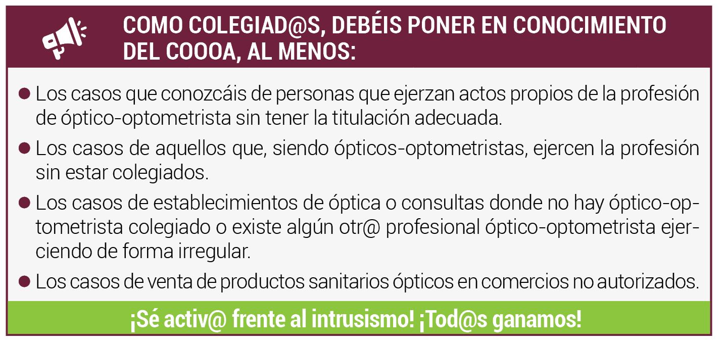 Sistemáticamente, el COOOA adopta las medidas necesarias para evitar el intrusismo profesional procediendo a requerir y, en su caso, denunciar ante la fiscalía o las autoridades sanitarias a quienes ejercen la profesión de óptico-optometrista sin reunir los requisitos legales para ello, a los establecimientos de óptica o consultas de optometría que por uno u otro motivo carecen de óptico-optometrista colegiado al frente o a aquellos que presentan alguna otra irregularidad colegial.