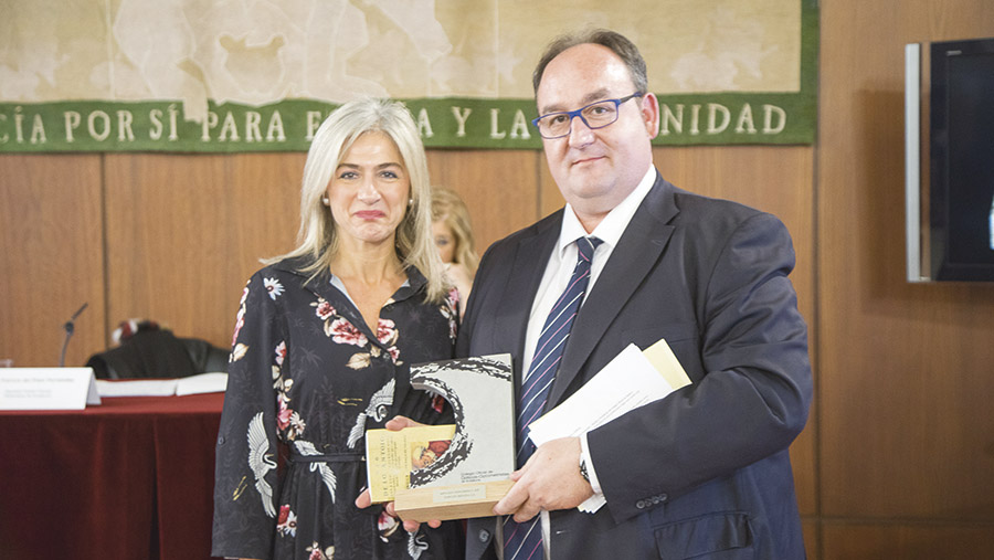8) Raúl Bellés, director general manager de Topcon España, recibe de la mano de Patricia del Pozo, secretaria segunda del Parlamento de Andalucía, el reconocimiento honorífico a esta entidad.