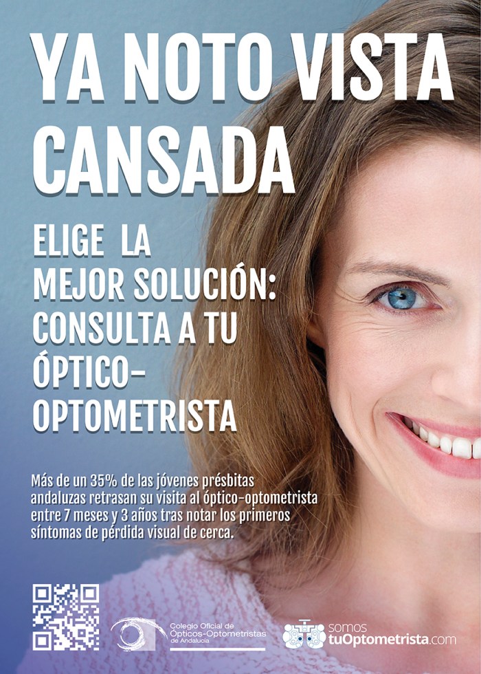 El Colegio Oficial de Ópticos-Optometristas de Andalucía presentará en las próximas semanas su nueva campaña social divulgativa de prevención, donde se ofrecerá información sobre los problemas asociados a la presbicia o vista cansada en la población comprendida entre, aproximadamente, los 38 y los 48 o más años de edad.