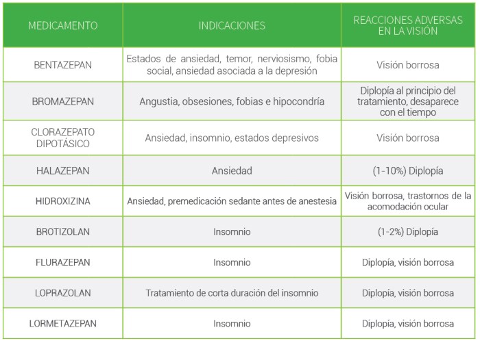 En términos generales, los ansiolíticos suelen recetarse por breves periodos de tiempo por los efectos e impactos físicos y psíquicos que podrían presentar a largo plazo en la persona. En el cuadro que verás a continuación puedes observar una serie de medicamentos que tienen como objetivo suavizar o eliminar este estado de ansiedad, cuáles son sus principales indicaciones y las posibles reacciones adversas que pueden provocar en el sistema visual.