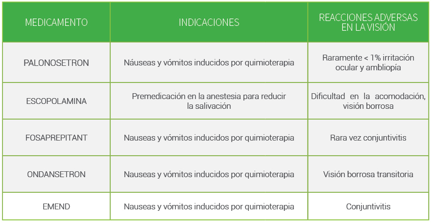 Un antiemético es un fármaco utilizado para impedir el vómito o las náuseas en los pacientes. Este tipo de medicamentos se usan, en términos generales, para tratar la cinetosis y los efectos secundarios de los analgésicos opioides, de los anestésicos generales y de la quimioterapia dirigida contra el cáncer. En el cuadro que verás a continuación puedes observar una serie de fármacos antieméticos, sus indicaciones y las posibles reacciones adversas que pueden provocar en la visión.