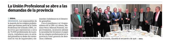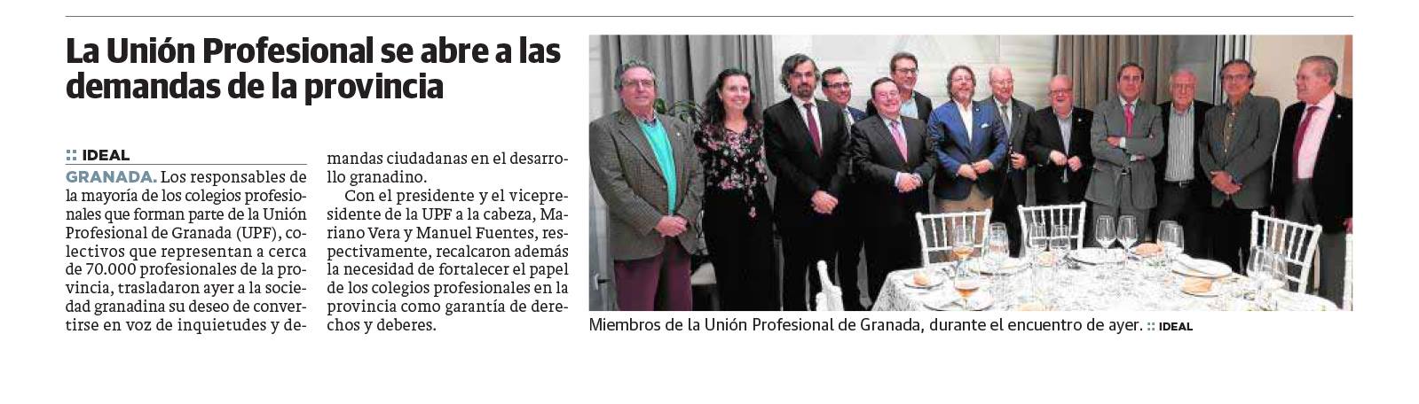 La vocal-delegada provincial en Granada del COOOA, Marta Fortis, representó el pasado mes de octubre a la entidad colegial en la reunión de la Unión Profesional de Granada, colectivo que representa a cerca de 70.000 profesionales. Durante el acto se trasladó a la sociedad granadina el deseo de convertirse en voz de inquietudes y demandas y fomentar el desarrollo de la provincia. Además, se recalcó la necesidad de fortalecer el papel de los colegios profesionales.