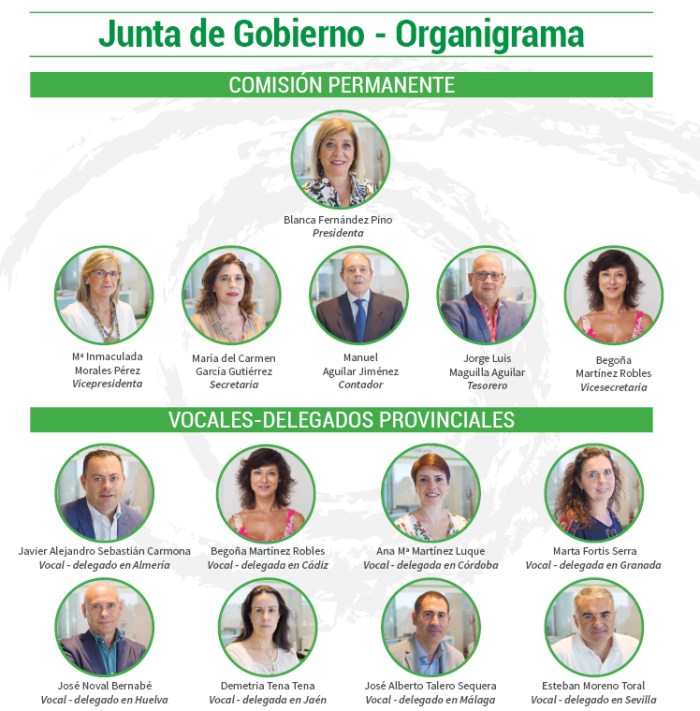 Los cargos de vicepresidenta, secretaria, contador, y los vocales-delegados de Granada, Málaga y Sevilla se renovaron por candidatura única. Para la vocalía de Huelva, al concurrir dos candidaturas, se organizaron elecciones en la provincia, en cuya votación resultó elegido por mayoría José Noval Bernabé. Asimismo, en el acto se incorporaron como vocales-delegadas Ana María Martínez Luque (Córdoba) y Begoña Martínez Robles (Cádiz).