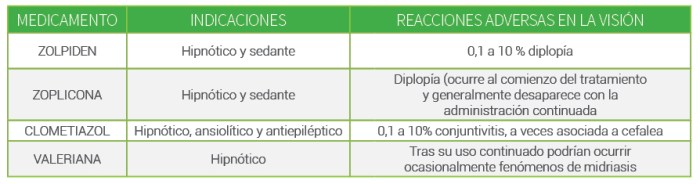 A continuación puedes ver un cuadro con una serie de medicamentos, sus indicaciones y las posibles reacciones adversas en la visión que puede provocar su uso para tratar los síntomas comentados anteriormente.