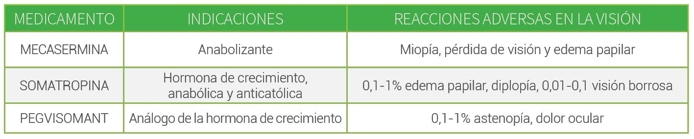 En el siguiente cuadro se incluyen una serie de medicamentos utilizados para aumentar esos niveles de crecimiento y los posibles efectos adversos que su tratamiento puede causar en el sistema visual del paciente.
