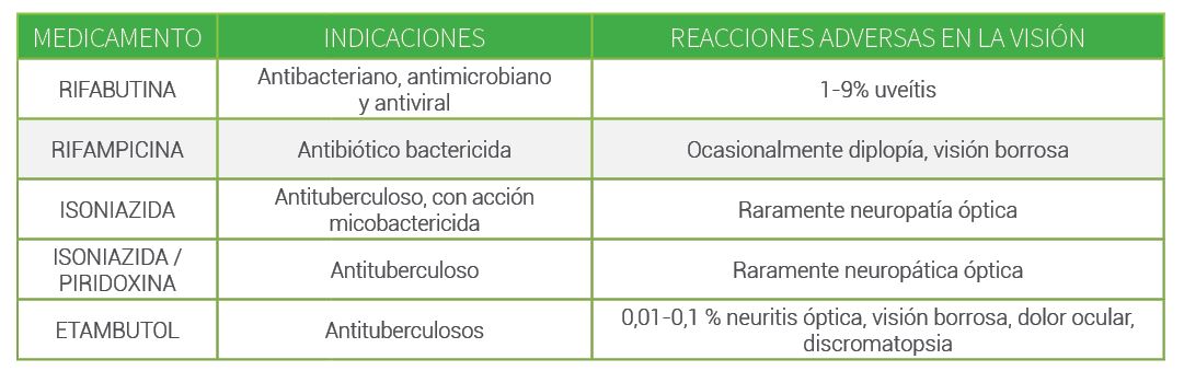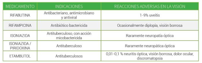 En el siguiente cuadro se incluyen una serie de medicamentos antituberculosos y los posibles efectos adversos que su tratamiento puede causar en el sistema visual del paciente.