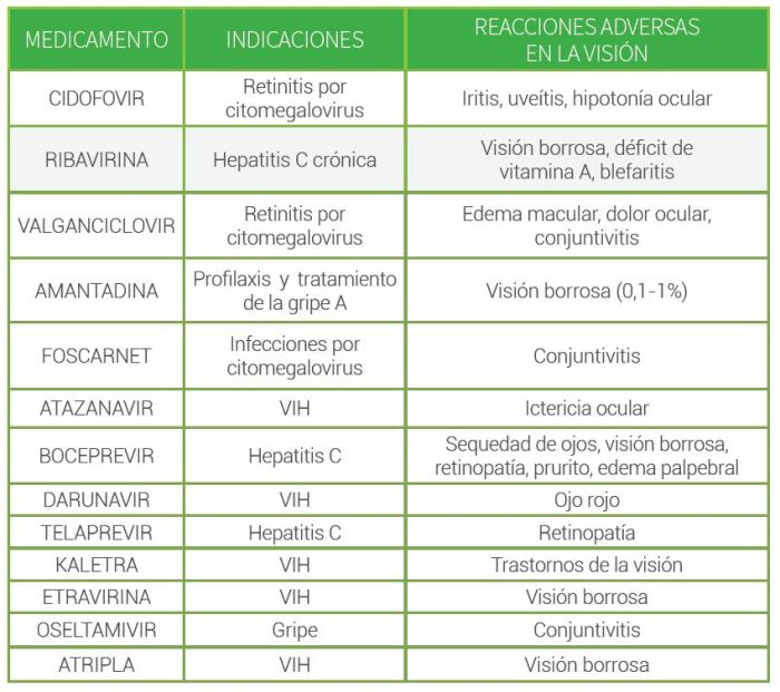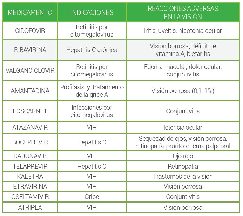En el siguiente cuadro se incluyen una serie de medicamentos antivirales y los posibles efectos adversos que su tratamiento puede causar en el sistema visual del paciente.