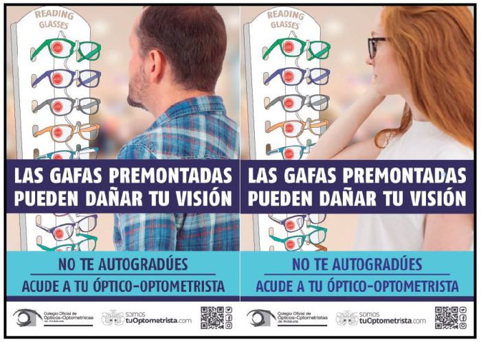 El pasado 22 de noviembre, el Colegio Oficial de Ópticos-Optometristas de Andalucía (COOOA) dio inicio a su nueva campaña de comunicación en la que ha abordado por completo la problemática de uso de las gafas premontadas, además de denunciar su venta en canales como tiendas de regalo, bazares, mercadillos o grandes superficies sin la prescripción ni control del óptico-optometrista.