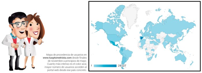Desde que en abril de 2014 el COOOA diera inicio a esta estrategia comunicativa destinada a profesionales y población general, la iniciativa TuOptometrista.com ha tenido un crecimiento exponencial traspasando fronteras. Los contenidos han pasado de tener un ámbito regional en Andalucía a gozar de un gran interés entre los profesionales sanitarios de la visión en España y el resto del mundo. En este último periodo, desde mediados de noviembre hasta principios de marzo, las páginas publicadas en el portal digital TuOptometrista.com han superado las 100.000 visitas, con más de 60.000 usuarios procedentes no solo ya de Andalucía y España, sino de países como México, Argentina, Chile o Perú.