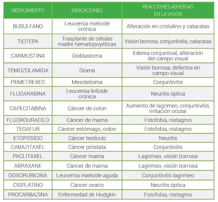 En el siguiente cuadro puedes observar una serie de medicamentos citostáticos y los posibles efectos que a través de su tratamiento puede causar en el sistema visual.