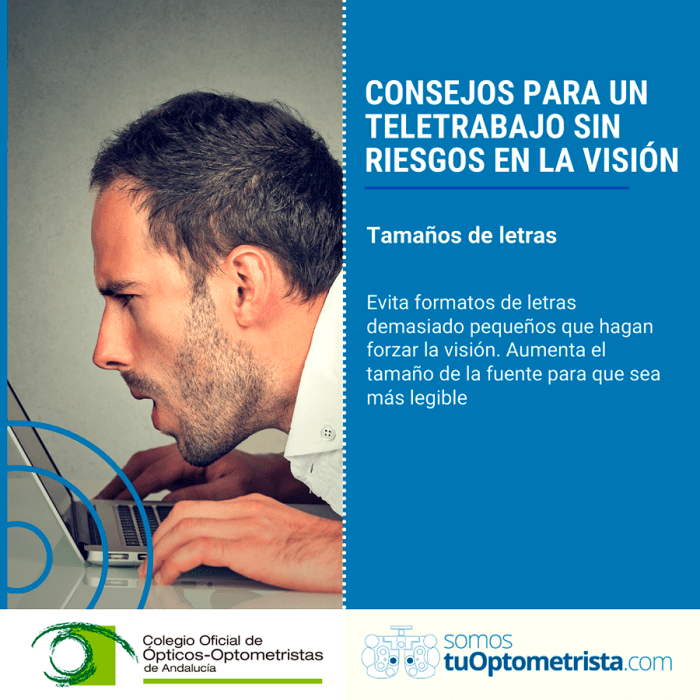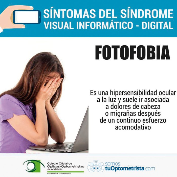 Por ello, desde el COOOA a través de TuOptometrista.com se ha puesto de manifiesto la importancia de informar sobre los síntomas asociados al Síndrome Visual Informático, entendido por el conjunto de problemas visuales que pueden surgir en la población que trabaja frente al ordenador o a las pantallas digitales un número de horas más alto de lo conveniente.