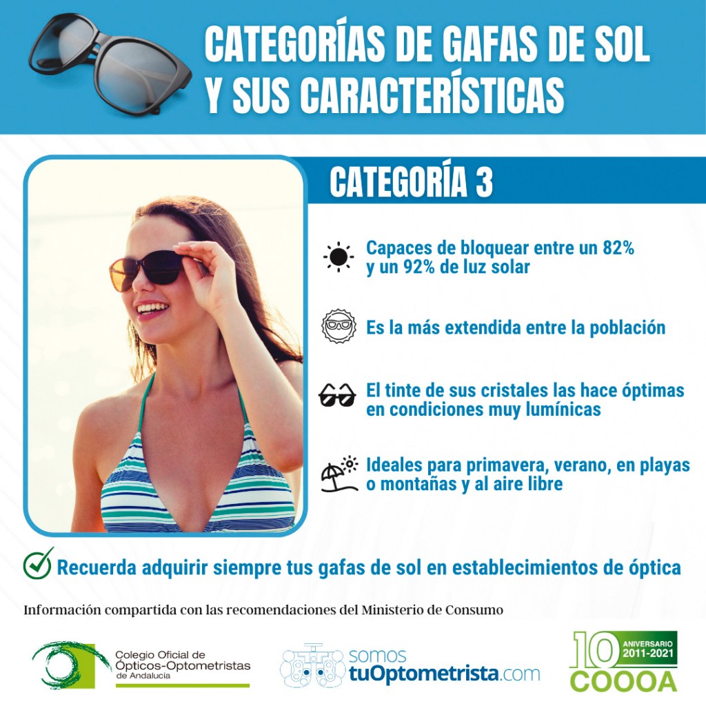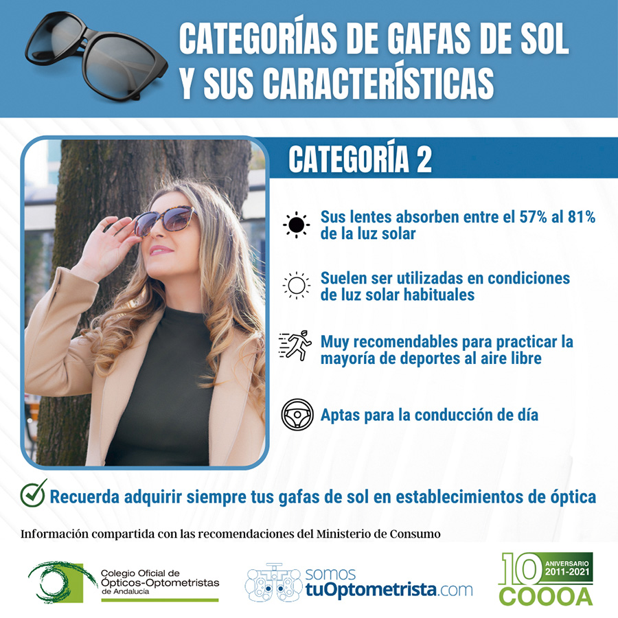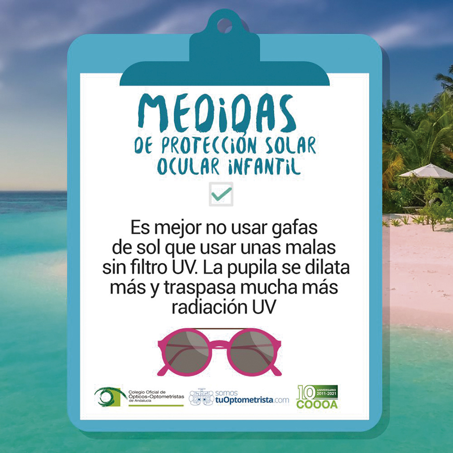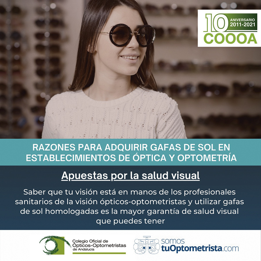 El Colegio Oficial de Ópticos-Optometristas de Andalucía ha continuado, durante los meses de verano, dirigiéndose a la población para incidir, a través de sus perfiles en redes sociales y en los de la plataforma TuOptometrista.com, en la importancia de llevar a cabo una adecuada protección visual y ocular. Entre estos consejos, el COOOA ha insistido especialmente en que las gafas de sol homologadas deben adquirirse en establecimientos de óptica y optometría y desechar otras opciones que pueden encontrarse en tiendas de moda, bazares, gasolineras o ciertos portales de Internet, que no cuentan con el control sanitario adecuado del óptico-optometrista.
