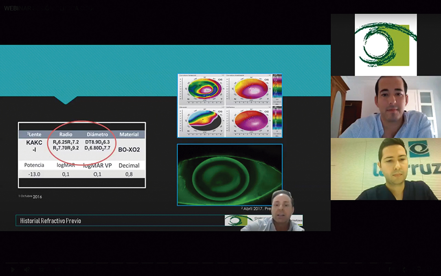 Presentado por Blanca Fernández, presidenta del COOOA, el encuentro online estuvo moderado por José Mª Sánchez, profesor titular acreditado del Grado en Óptica y Optometría de la Universidad de Sevilla, y contó con la participación de Timoteo González, optometrista clínico del Hospital La Arruzafa de Córdoba, que abordó la topografía, tomografía y biomecánica corneal en el queratocono durante su ponencia; Carlos Rocha, oftalmólogo del Hospital Universitario Virgen de las Nieves de Granada, que aportó sus conocimientos acerca del diagnóstico, valoración y evolución del queratocono pediátrico; Raúl Capote, optometrista, contactólogo y profesor del Grado en Óptica y Optometría de la Universidad de Sevilla, que trató el manejo refractivo del queratocono antes y después de los segmentos intraestromales.