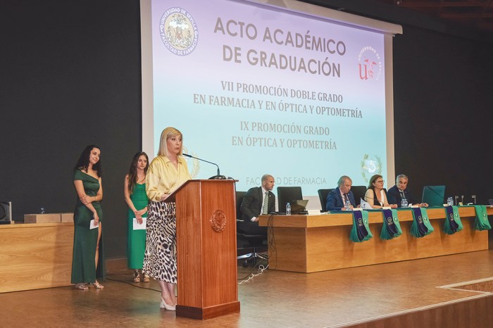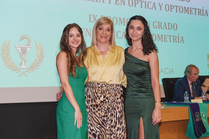 Además, la decana-presidenta del COOOA fue la encargada de reconocer a Beatriz Esquivel y Sandra Ramos, alumnas con el mejor expediente académico de las promociones del Grado en Óptica y Optometría y del Doble Grado en Farmacia y Óptica y Optometría.