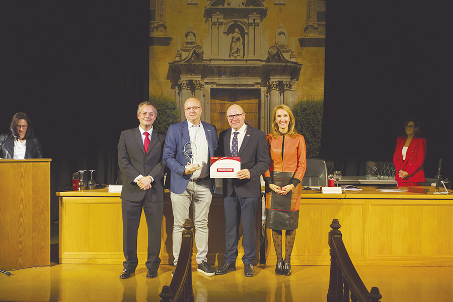 Recogió el galardón en representación del COOOA Raimundo Jiménez, vocal-delegado en Granada y vocal en la comisión de relación con universidades. En la imagen, junto al rector de la Universidad de Granada, Pedro Mercado; el vicerrector de Innovación Social, Empleabilidad y Emprendimiento, Esteban Romero; y la directora de Empleo y Prácticas, María del Mar Ortiz.