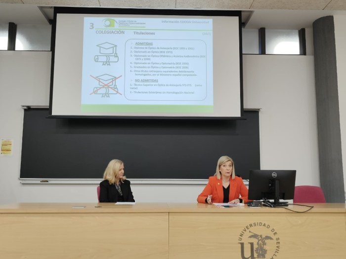 Blanca Fernández, decana-presidenta del Colegio Oficial de Ópticos-Optometristas de Andalucía, participó recientemente en las jornadas de la Facultad de Farmacia de la Universidad de Sevilla ‘El papel del óptico-optometrista en la vida laboral’.